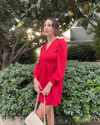 • Kadın uzun kollu V yaka belden hafif pileli scuba krep mini boy elbise