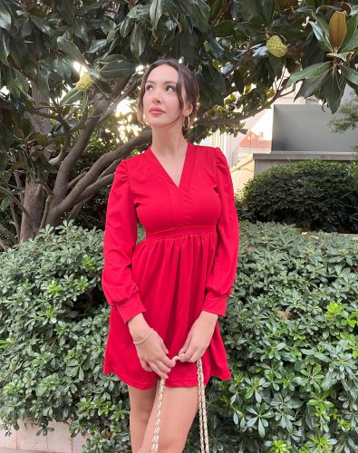 Kadın uzun kollu V yaka belden hafif pileli scuba krep mini boy elbise