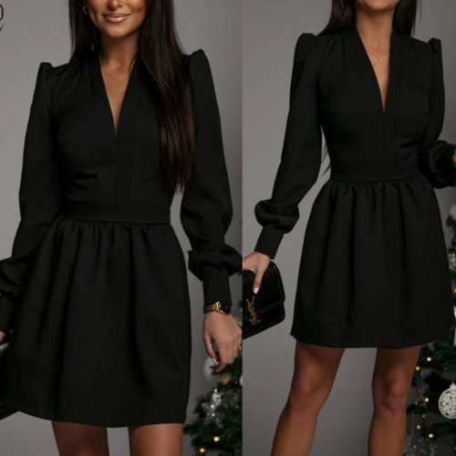 Kadın uzun kollu V yaka belden hafif pileli scuba krep mini boy elbise