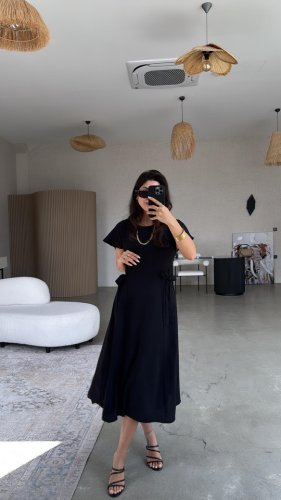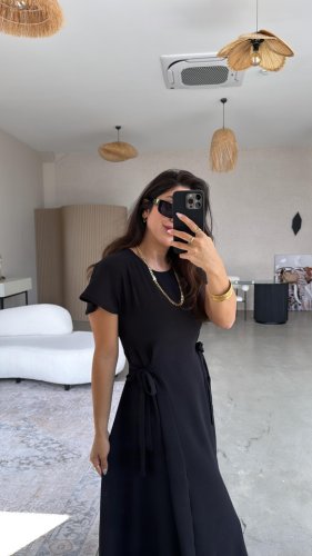 • Kadın aerobin kumaş arkası düğmeli yanı kuşaklı elbise