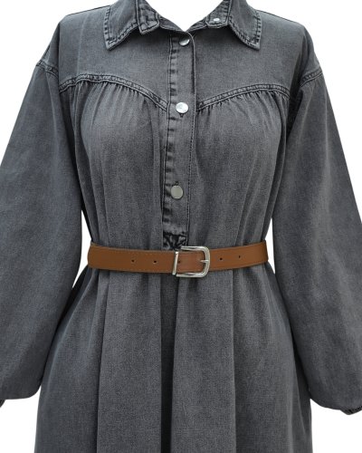 • Yarım Düğmeli Kolu Lastikli Kemerli Kot Elbise Füme
