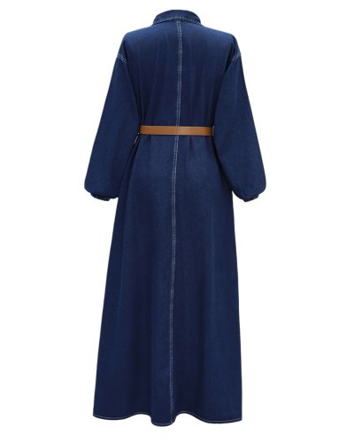 Yarım Düğmeli Kolu Lastikli Kemerli Kot Elbise Laci